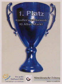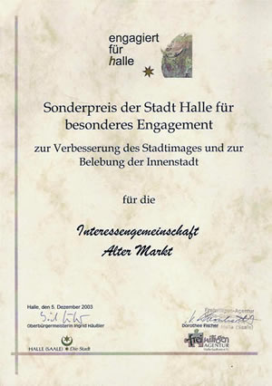 Unsere IG Alter Markt wurde 2003 mit dem Sonderpreis der Stadt Halle für besonderes Engagement ausgezeichnet.